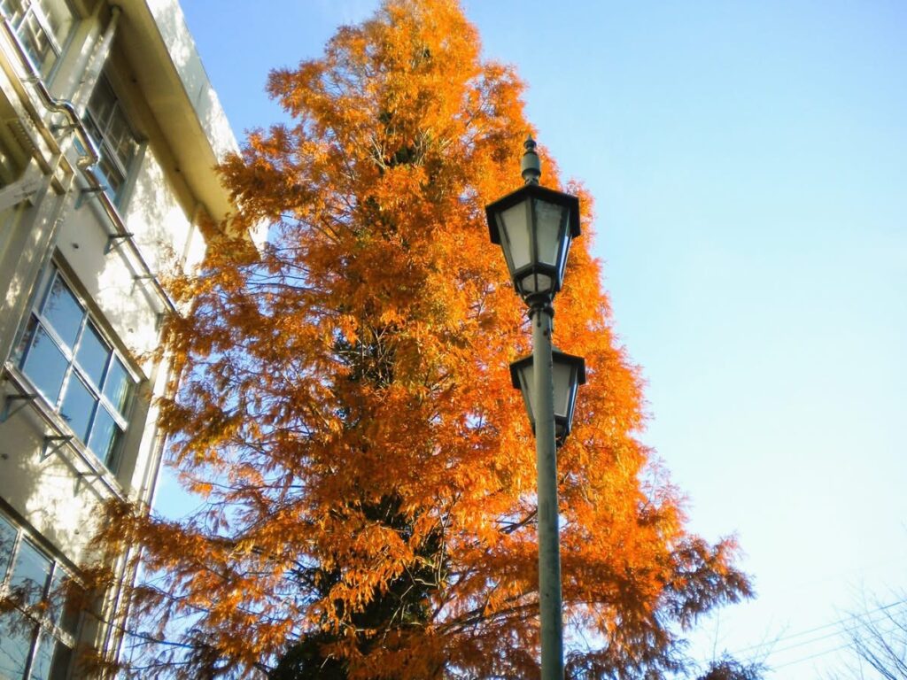 通用門を上がって右、家庭科室前の2本のメタセコイアも見事に紅葉しました。あの2本が清田校舎で一番ノッポの樹だったと思います。音楽室の窓からはその最上部が目の前にありましたね。
