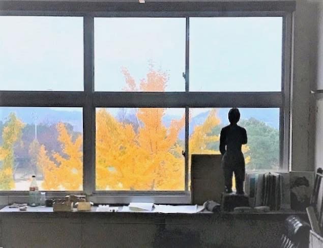 美術室の窓からの銀杏もなかなかのものです。銀杏のむこうにプール、新体育館、グラウンド、そして部活生の姿。ぼーっと目を遠くにやると美術館の丘、金毘羅山、戸畑・小倉越しの海まで見渡せました。