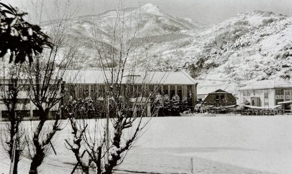 大蔵時代、校舎の背中に皿倉山が迫る雪景色は格別に素晴らしかったでしょう。雪中行軍(!)やマラソン、河内の雪道の写真も残ります。
