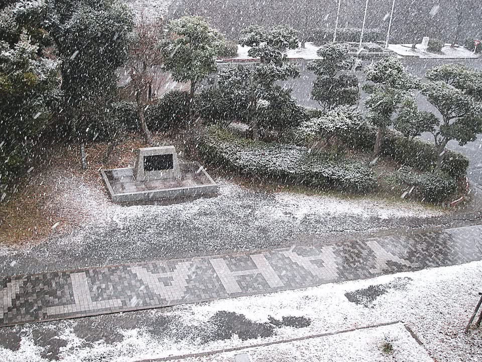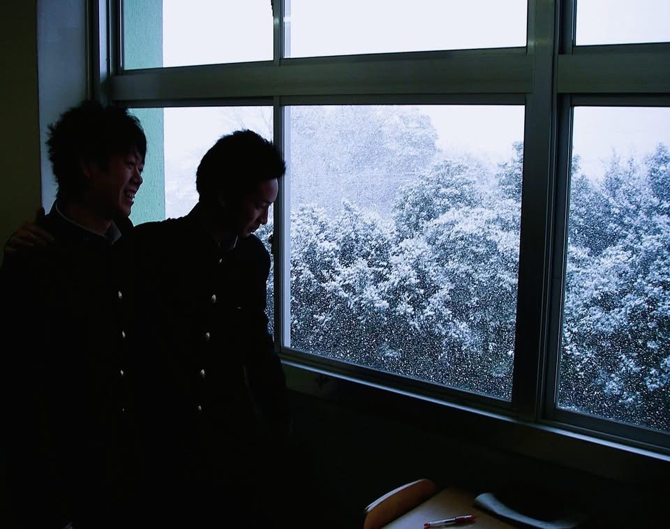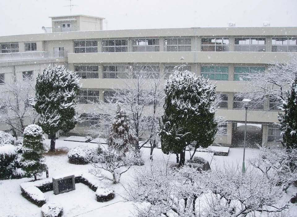 教室の窓から降りしきる雪を眺める。ひっそり雪に静まったモノクロ風景は、いつもの八高とは別のよう。やや寂しくて、綺麗で、いい感じです。