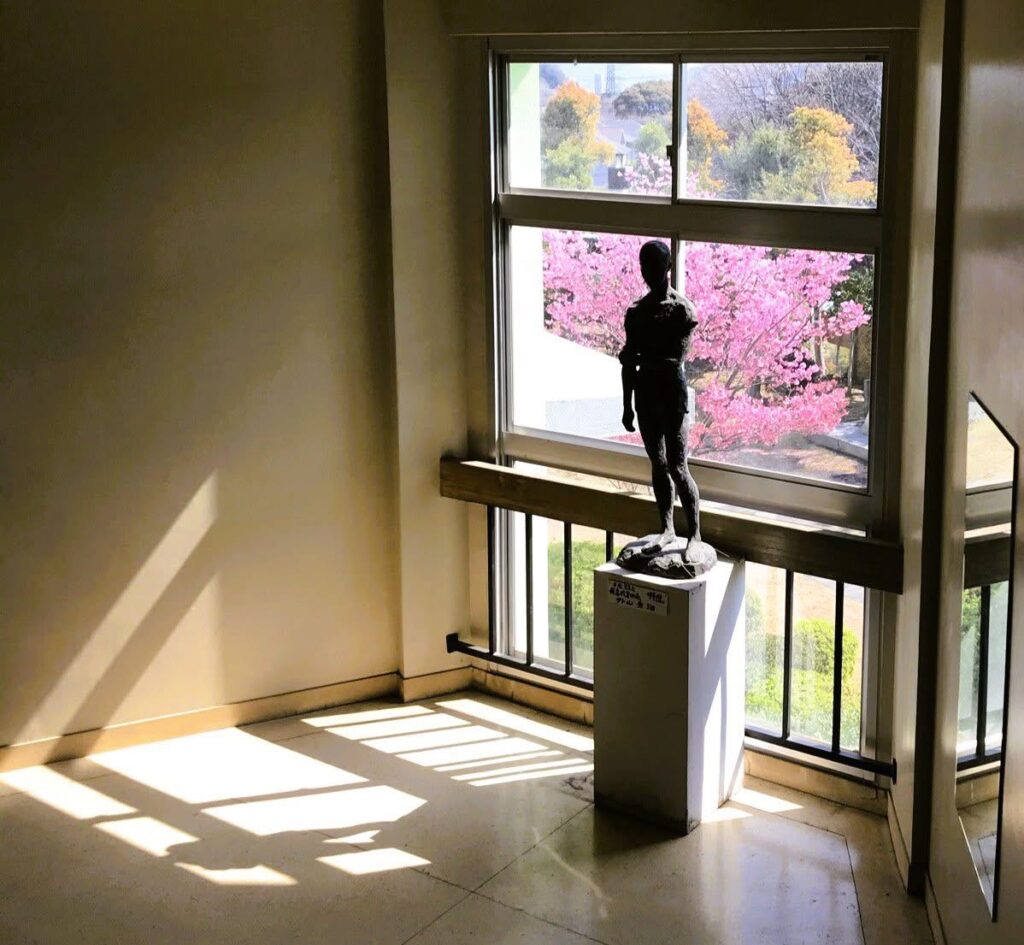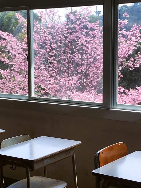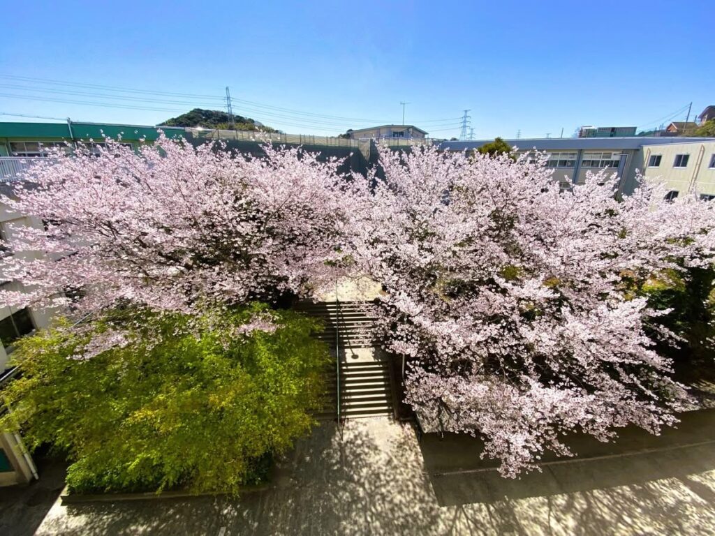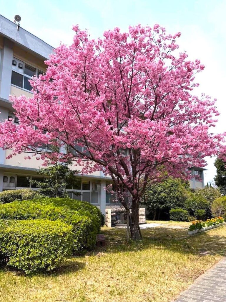 文系棟の窓には河津桜がきれいです。清田校舎でも一番に咲く桜です。時にドキッとする鮮やかさで迫ります。『誠鏡』の碑の横、この河津桜は高校12期の先輩方が還暦記念に植えられたもので、もう25年ほど経つのだと思います。