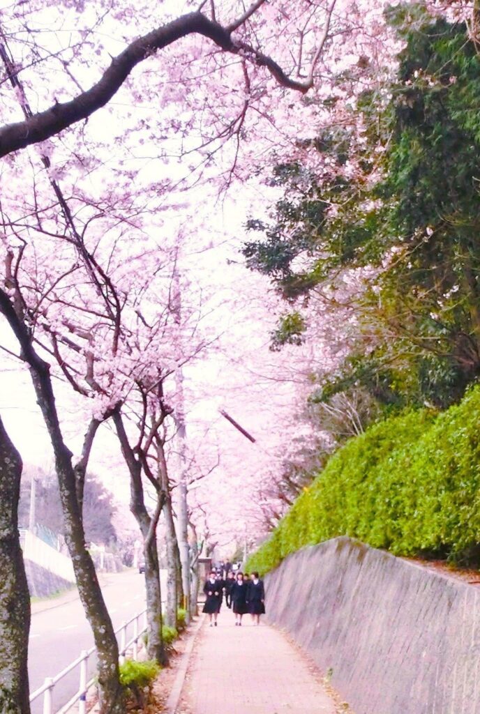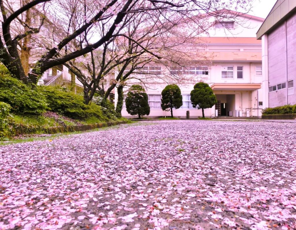 体育館の周辺ではいつも吹奏楽部が練習しています。フルートやトロンボーン、演奏は風に乗り、桜が舞います。この景色が素敵なのです。
